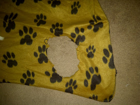 Just so you know where that hole is used to be a stiched in picture of a chihuahua.  Guess she didn't like it since this is a perfect circle!  LOL  So all night last night I kept saying what did you do to your blanket?  I guess she got tired of me saying it because all I got was the look of "Will you just let it go???  It happened...get over it."