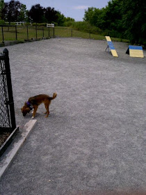 Yup...you see....NO OTHER DOGS!!!  Are you kidding me?  It was probably around lunch time on a Saturday afternoon.  So poor Zoey is so disappointed and really didn't look like she was having any fun.  Well how could she with no  other dogs to play with.  So the gate opens and here comes another dog!  Of course Zoey gets excited and the other dog was not having it and walk away. They stayed for about 5 minutes.  So Zoey was a good sport and scopes out the place for another few minutes.